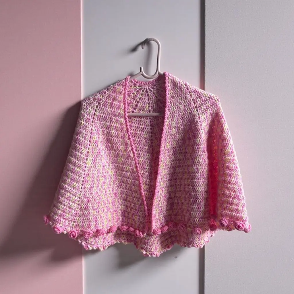 A soft blush-toned crochet shawl designed with an elegant lace pattern and delicate floral-inspired scalloped edging. Light and breathable, it drapes gracefully over the shoulders, adding a touch of warmth and charm to any outfit. Perfect for special occasions, evening wear, or elevating everyday style with a handcrafted touch of elegance.